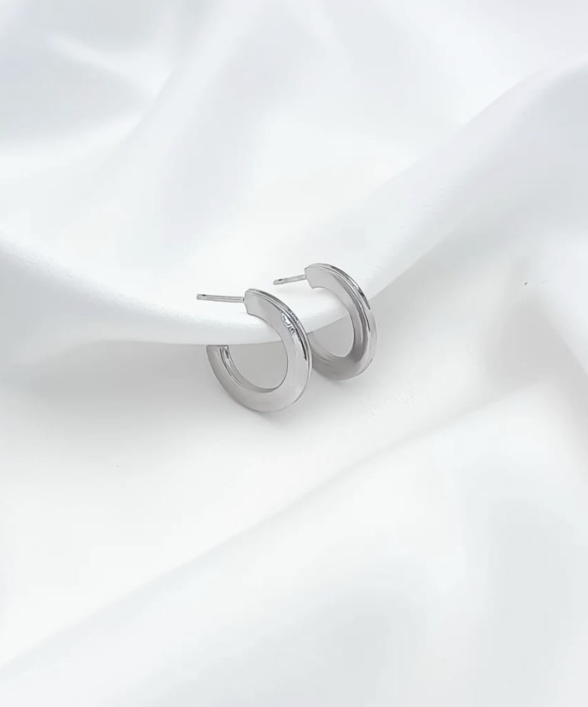 Argola feita de ródio branco, de tamanho pequeno e com sua forma achatada.